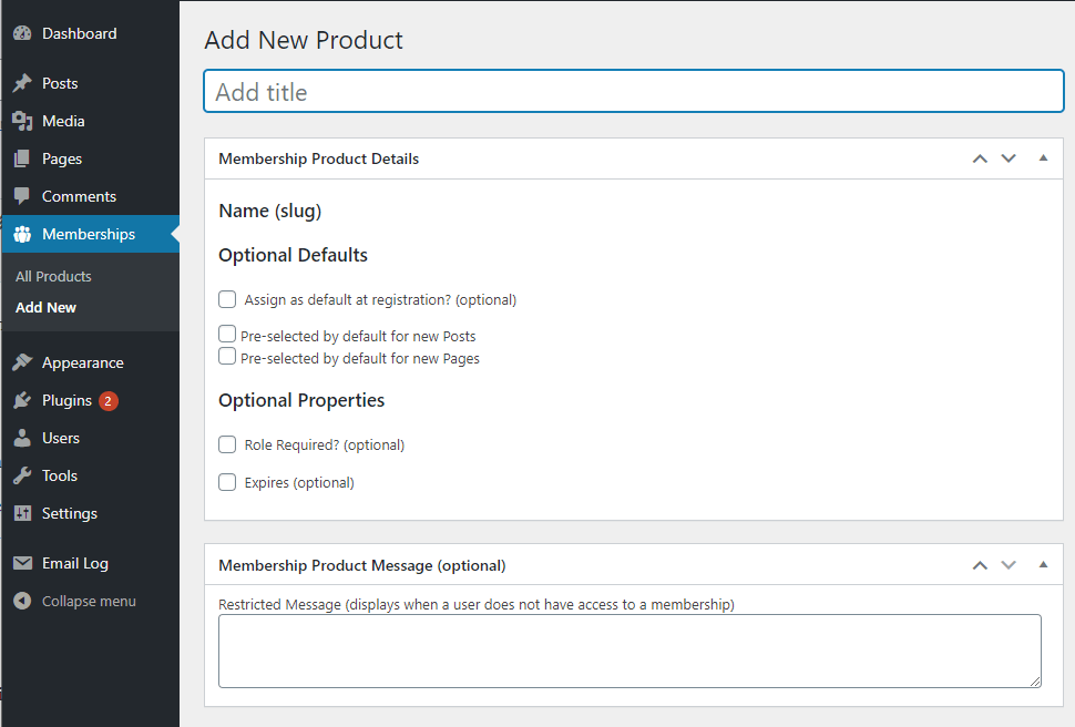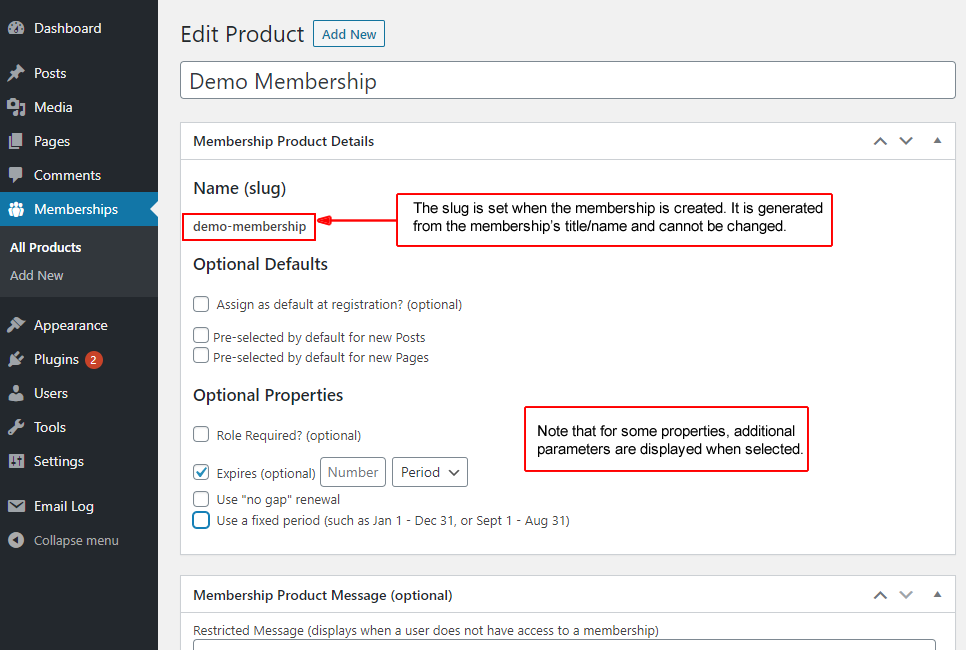 When creating a new membership or editing an existing one, the membership detail has a number of properties and options you can set. Many of these are optional and some will display additional available properties when selected. Be sure that you understand what each property does and is intended for. Note that the slug name is set automatically and cannot be changed.
