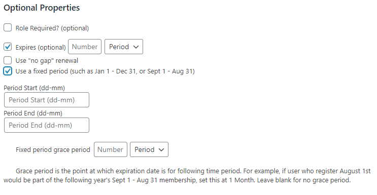 Fixed period – This is an optional setting for creating a “calendar year” expiration period. The additional properties for this type of expiration period are the period start and end, which need to be defined as dd-mm. For example, if your period starts September 1 each year, then the period start is 01-09 and the period end is 31-08. The “grace” period is optional and is specifically for new registrations. If you set this to 1 month, then a user who registers during August would have their expiration date set at August 31 of the following year. If they register before that, it would be August 31 of the current year. This gives you a window to allow new registrations prior to the beginning of the period. (This does not affect existing users. If an existing user renews, it will just add 1 period from their current expiration date.)