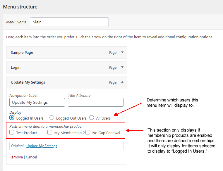 You can set display options for individual menu items to identify whether a menu item displays to a logged in user, logged out user, or all users.