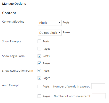 This section handles content blocking settings and how that will be displayed.  There will be a setting for each post type that the plugin is set to handle.  By default, this will be Posts and Pages.  However, if custom post types are identified in the Custom Post Types section, those will be added here.