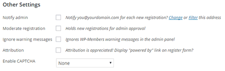 This section of settings handles some generic settings such as notifying the admin of new registrations, setting admin approval (moderated registration), and use of CAPTCHA.