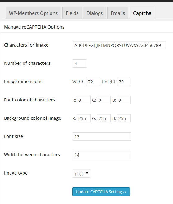 Once enabled in the plugin’s main options, you can customize the CAPTCHA in the CAPTCHA tab. You can specify the characters used in the image, the number of characters, image dimensions, font color, background color, font size, width between characters, and the type of image that is used.